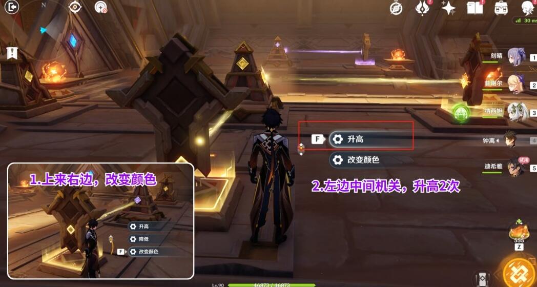 7、继续向前,先把右边的机关【改变颜色,变成紫色】,再把左边中间的机关【升高2次】;
