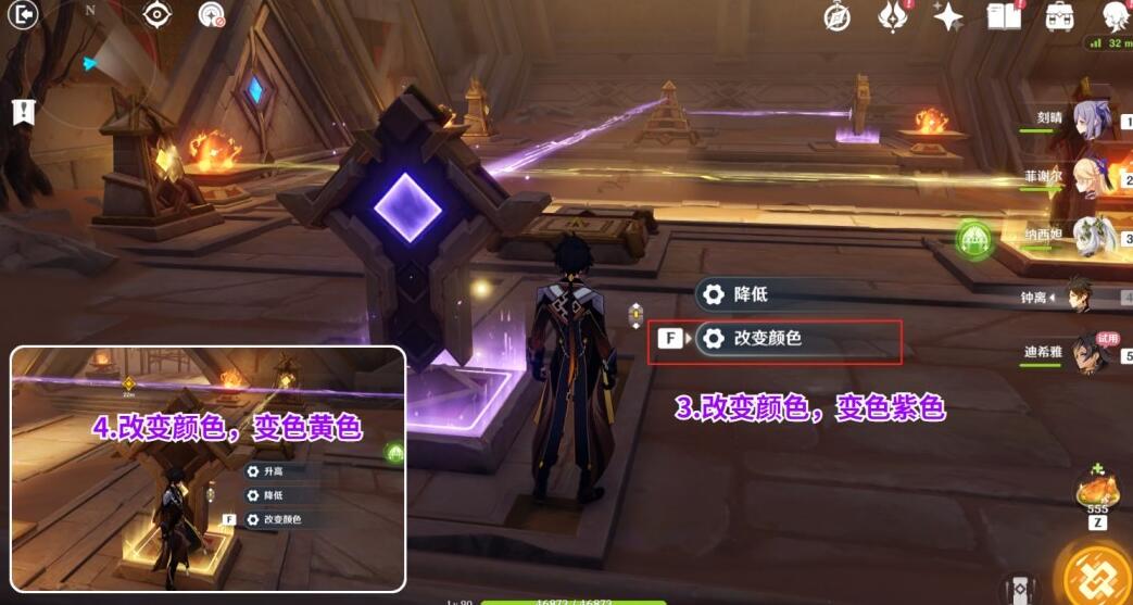 升高之后再【改变颜色,变成紫色】,最后来到右边【改变颜色,变成黄色】,就能开门了。