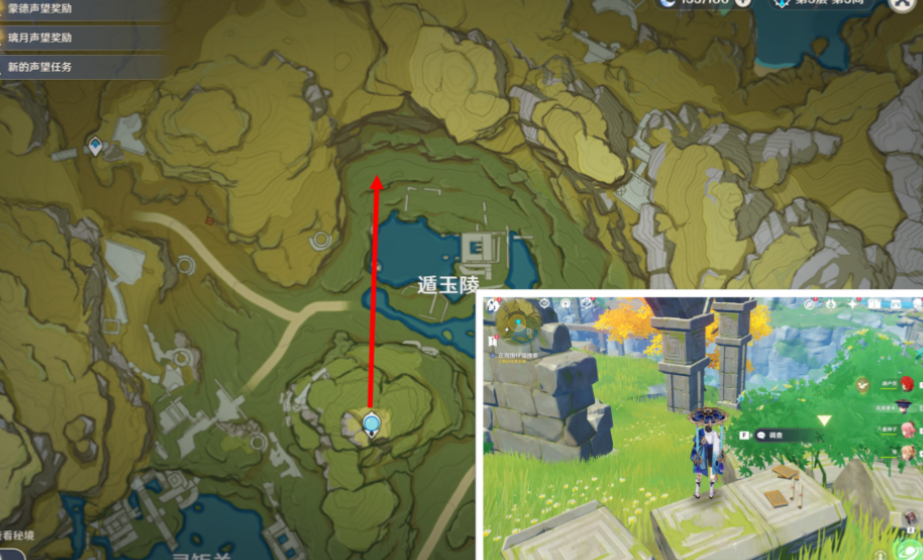 3、我们去藏宝图上指示的地点,从灵矩关东北方的神像出发去遁玉陵,找到石柱。