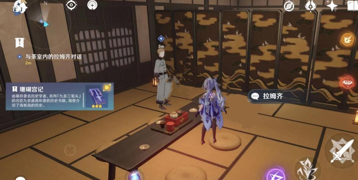 3、进入木漏茶室,继续和NPC拉姆齐对话,获得书本《珊瑚宫记》。