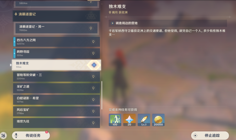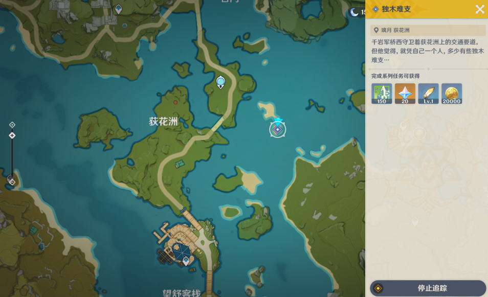 1、我们传送到荻花洲的神像,找到驻守在附近的NPC千岩军桥西,和他对话就能接取独木难支任务了。