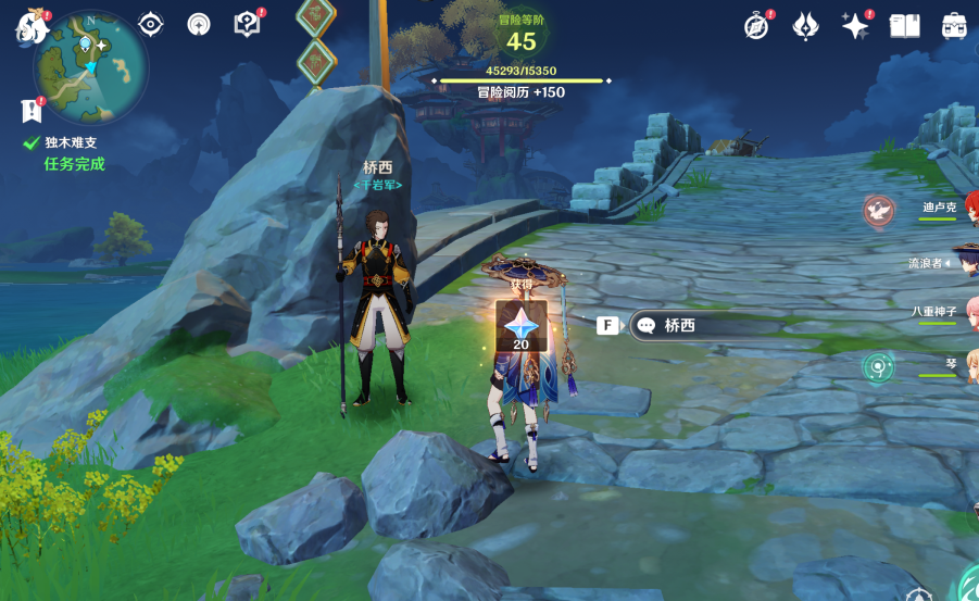 3、击败丘丘人后回到NPC桥西这里,和他再次对话就完成独木难支任务了。
