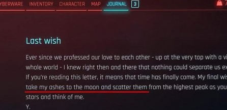 5.还有如果你正在读这封信,那就意味着时间终于到了。我最后的愿望是,你把我的骨灰带到月球上,当你凝视星空、想起我时,把它们撒在最高的山峰上。—Y(叶)。