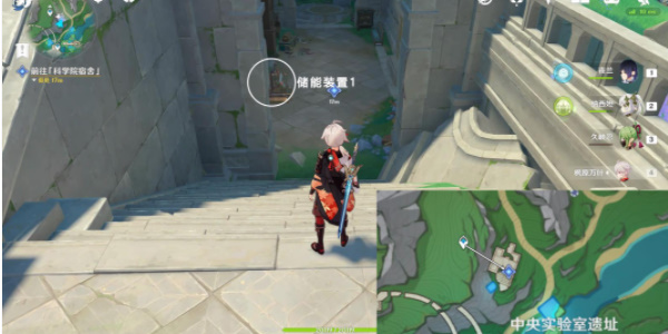 1、首先我们来到图上中央实验室遗址的传送锚点,向东南方向走去到储能装置1的位置。