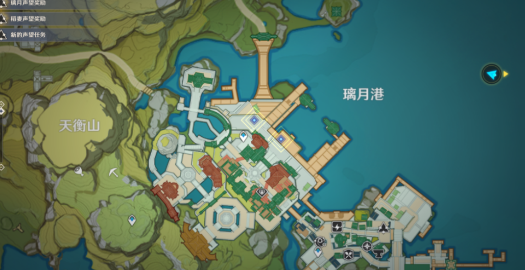 1、首先我们打开璃月的地图,看到孤云阁区域,右下方的船只标志就是死兆星号啦,我们可以直接传送过去。
