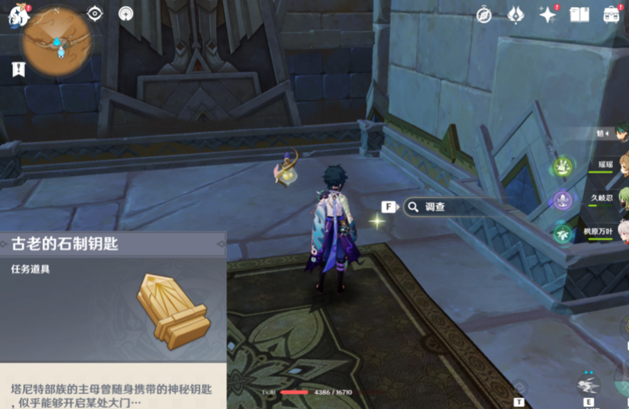 2、地毯右上角有一个闪光点,我们点击调查就可以获得古老的石制钥匙了。