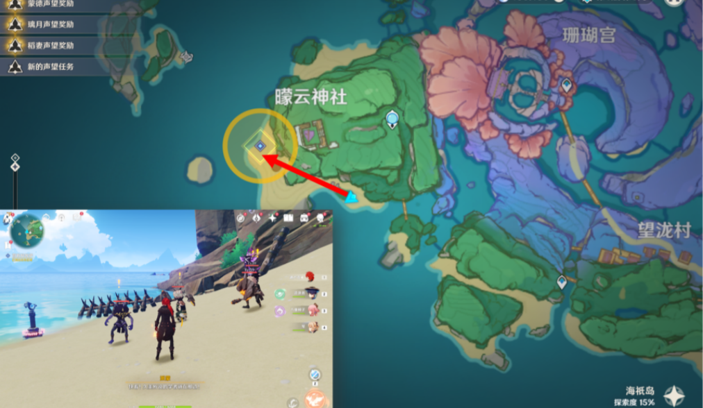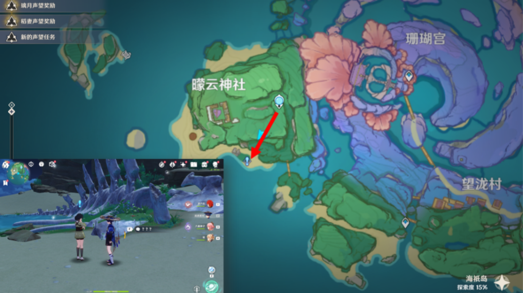 1、我们从海祇岛矇云神社的神像向西南方向出发,找到NPC久美和她对话接取孤独的海兽任务。