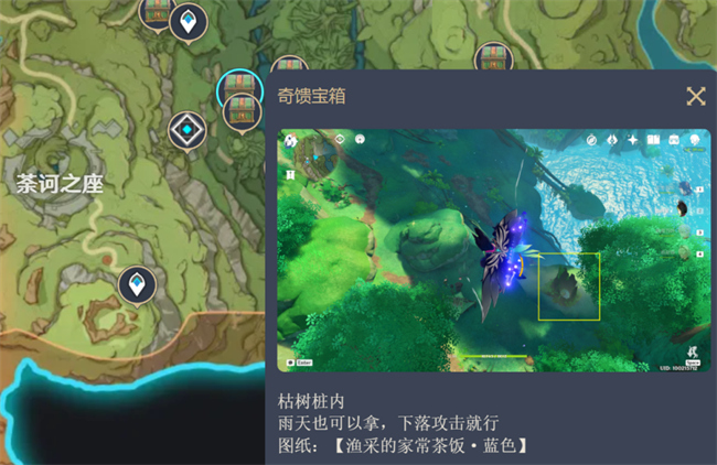 晴天的水天丛林,奇馈宝箱在树桩里面。