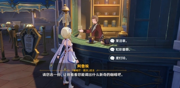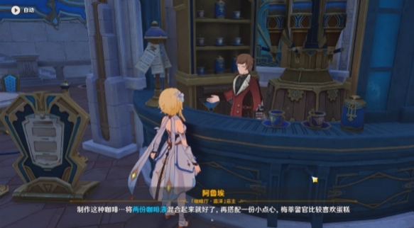 2、首先我们前往枫丹廷的咖啡厅,和店主阿鲁埃对话。