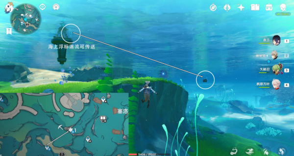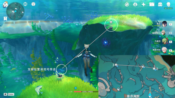 1、我们来到塞洛海原左下方的传送锚点,将视角朝小地图东北方向转,通过湍流到达宝箱上方。