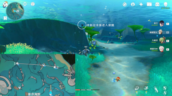 2、我们来到塞洛海原右上方的传送锚点,直接冲刺水面进入屏障就能获得宝箱。