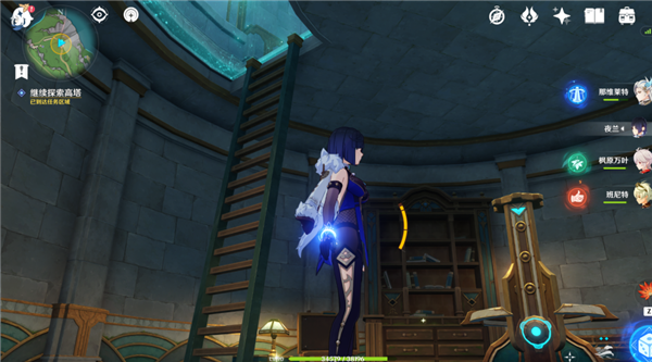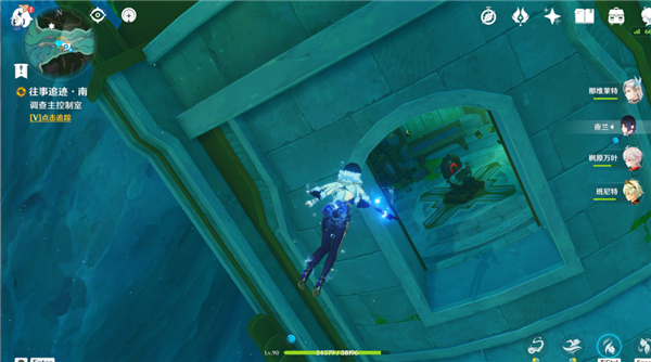 前往下层追上愚人众指挥官,如图所示把能量转移到柜子顶上的装置,然后拾取能量装置放到旁边机关去开侧门;