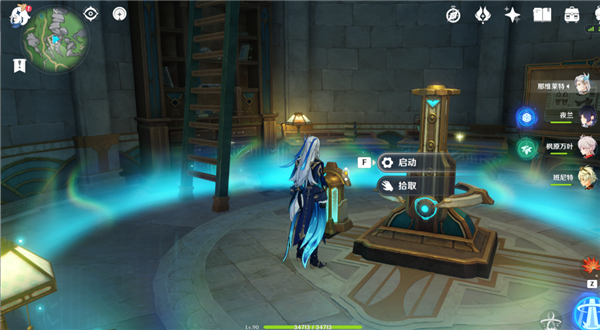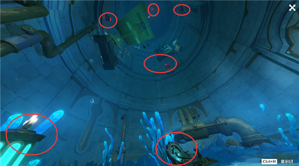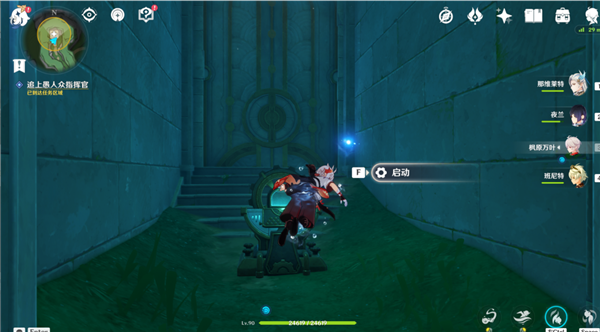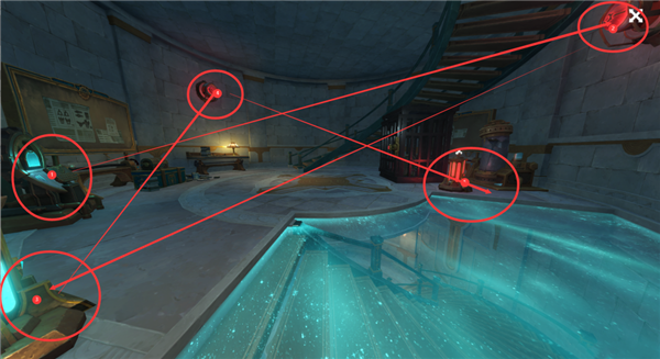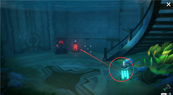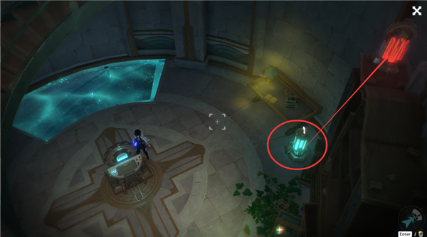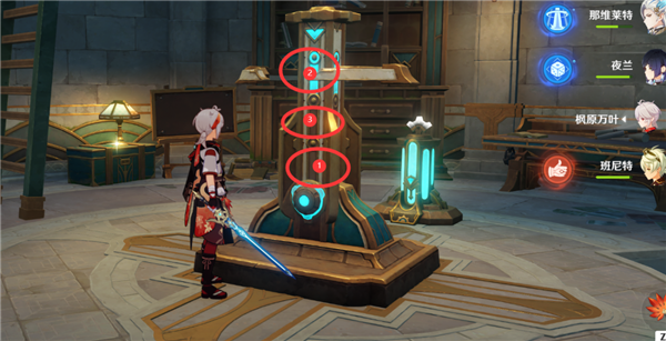 如图所示进行机关解谜,启动机关后当机关上的指针对着亮着的区域时,我们使用普攻打装置即可;