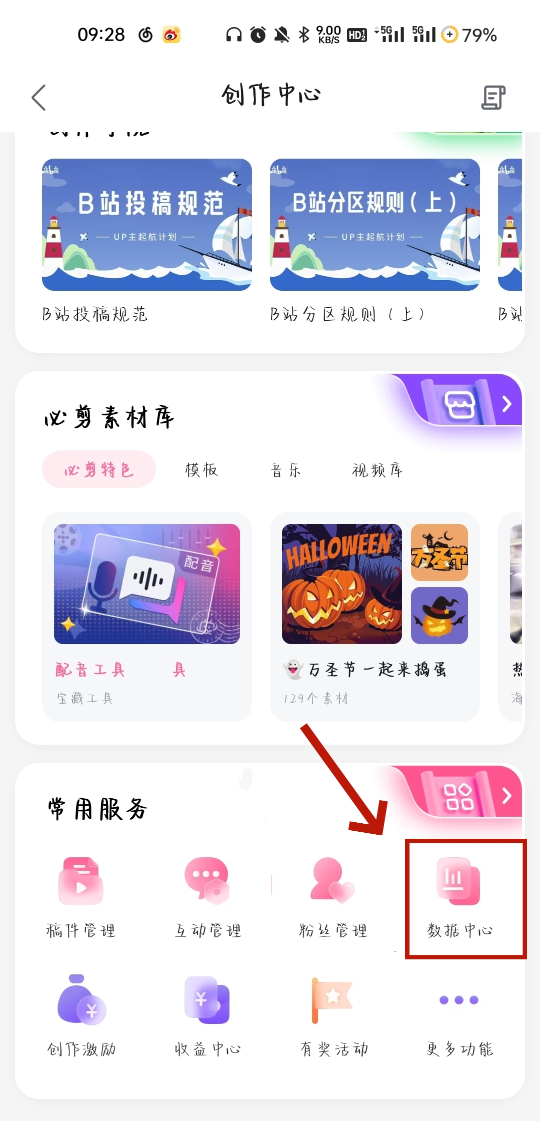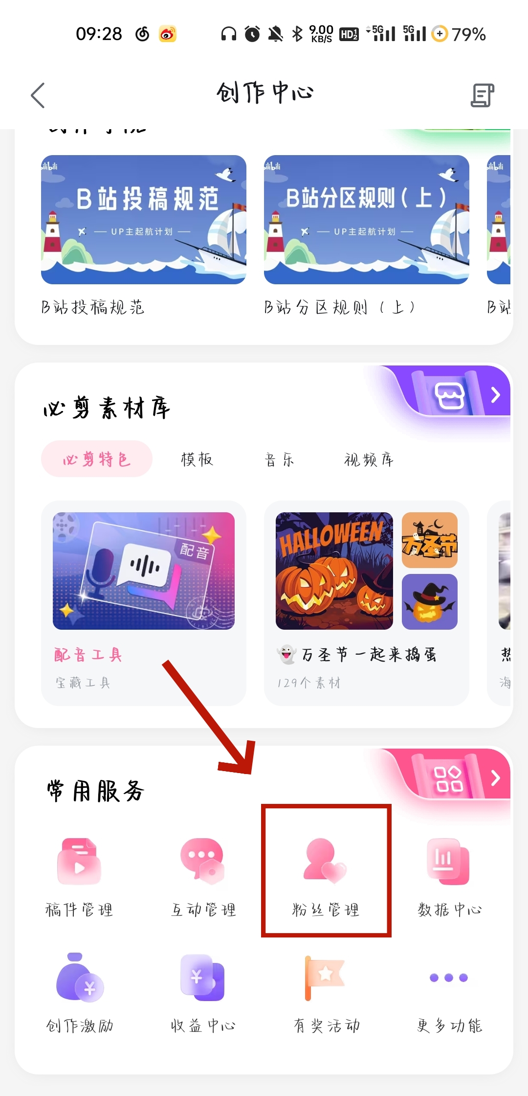 2、在【创作中心】页面中,下划找到常用服务栏目中的【粉丝管理】。
