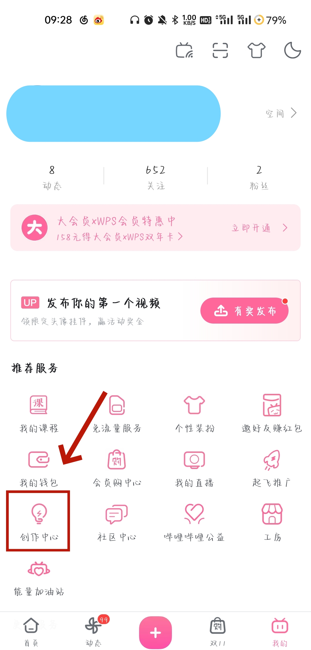 1、首先我们来到b站【我的】页面,点击【创作中心】。