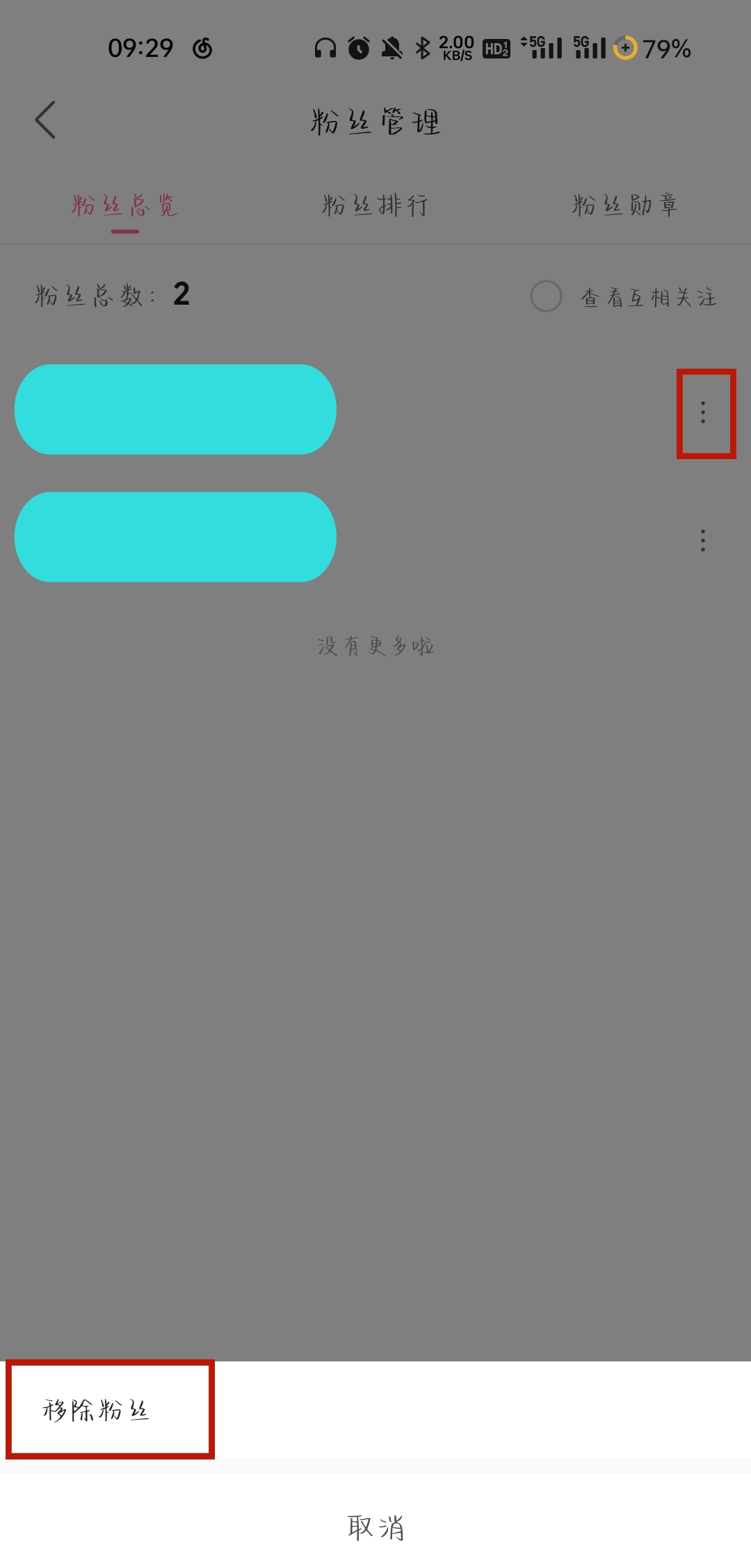 3、进入【粉丝管理】页面后我们就可以管理粉丝了,点击粉丝名字右边的“三个点”,就可以【移除粉丝】了。