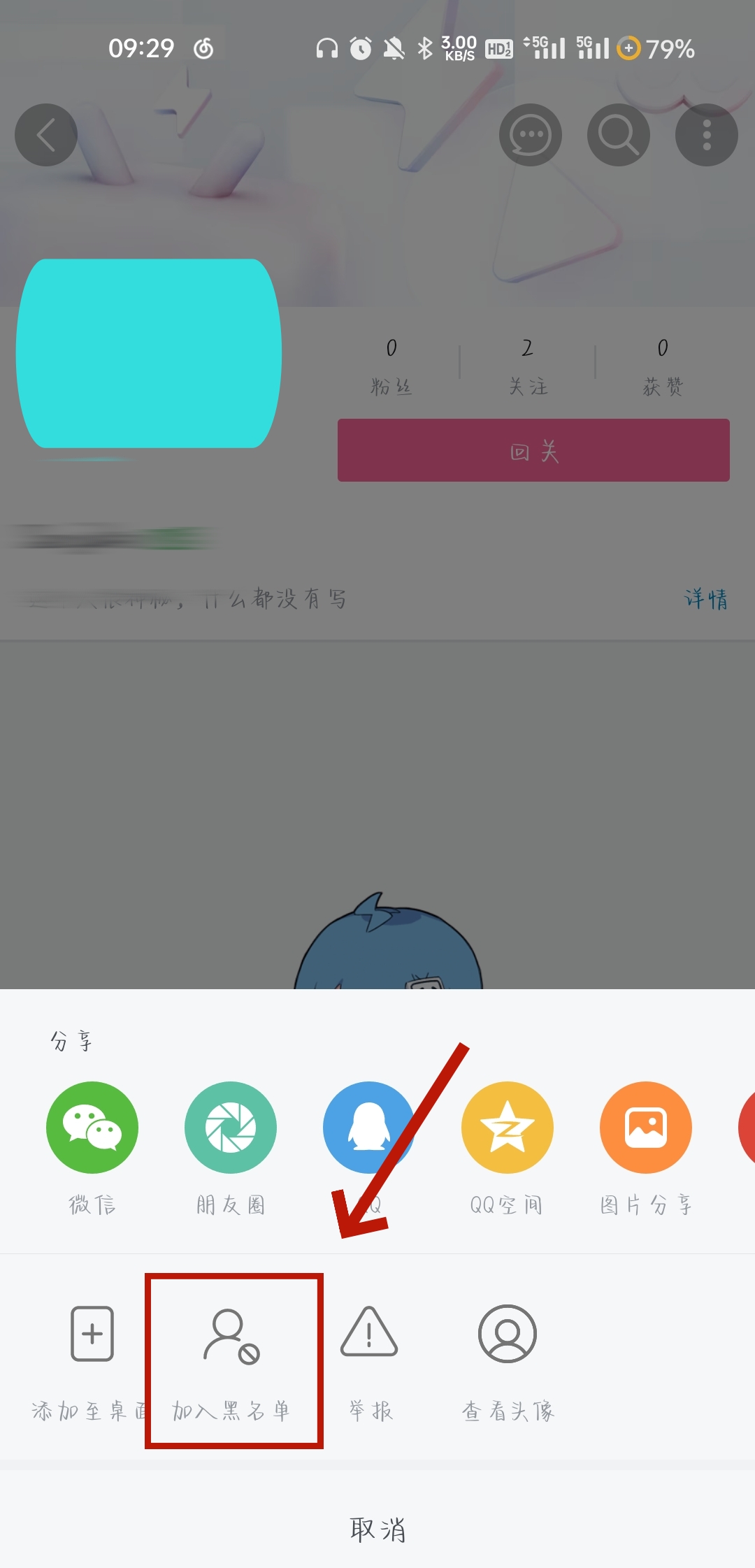 4、我们也可以点击粉丝的个人主页,把ta加入黑名单解除关注。