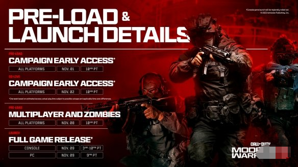 《使命召唤:现代战争3》将于11月10日正式发售,动视公布了《使命召唤:现代战争3》单人战役、多人和僵尸模式的预载和解锁具体时间,详细如下(以下换为北京时间):