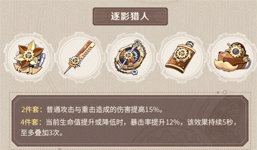 林尼的圣遗物建议选【逐影猎人】,这套圣遗物非常契合林尼的输出机制。