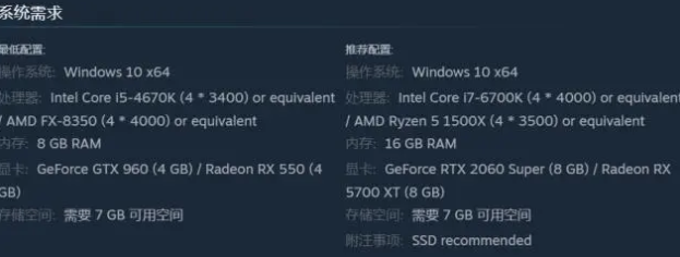 处理器: Intel Core i7-6700K (4 * 4000) or equivalent / AMD Ryzen 5 1500X (4 * 3500) or equivalent