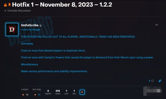 《暗黑破坏神4》1.2.2版本热修补丁现已更新,官方表示在10月22日关闭的交易系统现已恢复,另外修复了近期颇为流行的复制bug,这意味着“复制都瑞尔门票bug”可能将成为过去。完整热修补丁内容如下: