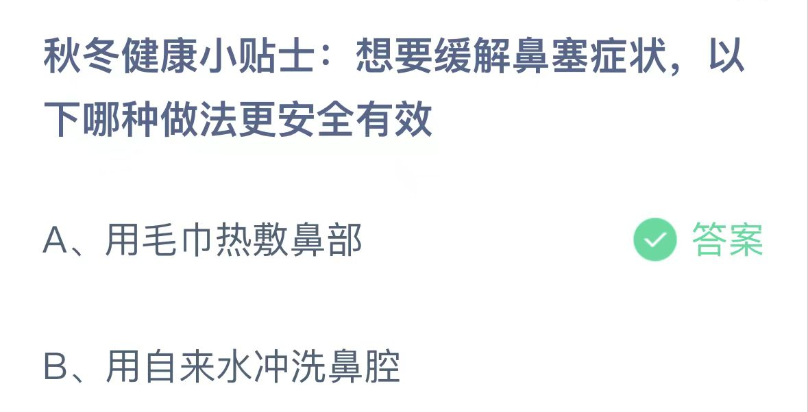 A、用毛巾热敷鼻部 B、用自来水冲洗鼻腔