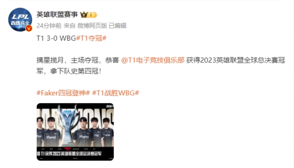 《英雄联盟》S13总决赛已经结束,T1 3:0 WBG获得冠军,这也是T1战队拿下的全球总决赛第100胜,排名历史第一,Faker也成功拿下了自己的S赛第四冠。