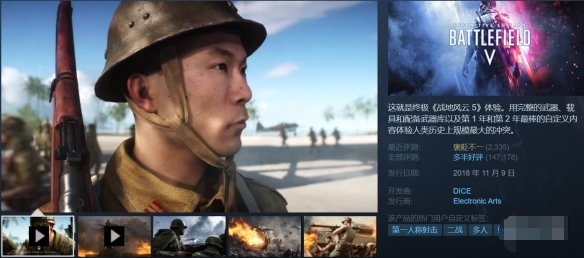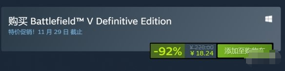 近日,随着Steam商店开启了秋促活动,EA旗下的第一人称射击游戏《战地5(Battlefield V)》也开启了新史低促销,0.8折优惠仅售18.24元。截止日期11月29日。