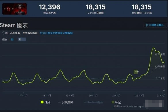 在双重推动力的帮助下,《暗黑破坏神4》的在线人数峰值再创新高。根据SteamDB数据统计,新的在线人数峰值达到了18315人。截至发稿时为止,游戏在线为12396人。