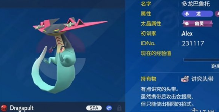 2、这个宝可梦的语言是西班牙语,特性为恒净之躯,等级为50级,携带的道具是讲究头带并拥有对战冠军奖章。