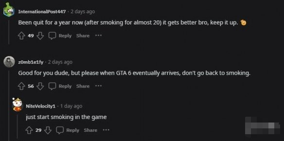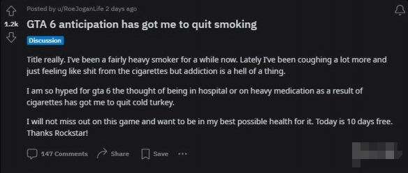 最近国外网友RoeJoganLife在Reddit发帖称,自己要开始戒烟了,因为《GTA6》即将到来,他不想因为吸烟引发疾病,而无法第一时间体验这款游戏。