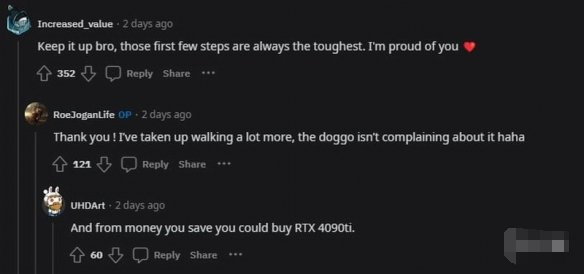 RoeJoganLife的帖子也激励了很多的玩家,不少玩家效仿这样的行为,也有玩家表示:《GTA6》居然有这么大的魅力。有玩家表示我也有类似的想法,希望我们都能保持健康的身体,也有玩家表示,很高兴你戒烟了,但是《GTA6》推出时,不要重新开始吸烟。