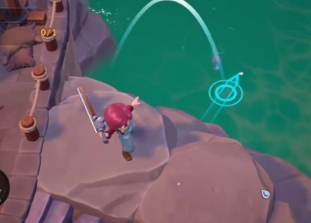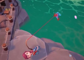 2、我们先找到有鱼的地方,切换到鱼竿,然后蓄力甩出去,间歇性晃动鱼饵吸引鱼群。