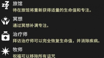 4、旅馆可以为我们提供生命和专注,冥想为我们补满专注,治疗师可以恢复满量生命值以及消除疾病,牧师可以移除所有诅咒。待在旅馆将重新获得适量的生命值和专注。