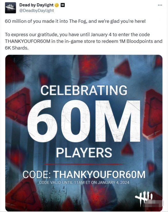 今日,官方发文祝贺《黎明杀机(Dead by Daylight)》全球玩家数突破6000万,为感谢玩家对游戏的支持,官方发放了一系列奖励来回馈玩家。