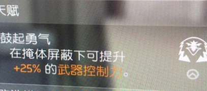1、鼓起勇气是游戏中的一个天赋,效果是在掩体遮蔽的情况下提升25%武器控制能力,可以让我们打的更加精准。