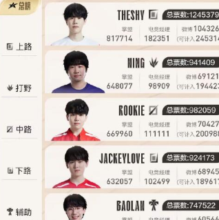 1、全明星正赛投票结果上单theshy 1245379票、打野ning 941409票、中单rookie 982059票、下路jackeylove 924173票、辅助baolan 747522票。