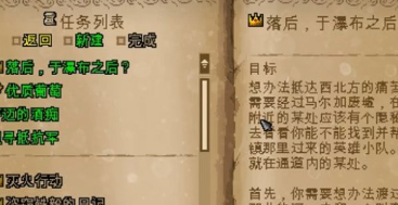 1、落后,于瀑布之后,这是一个游戏中标志性主线任务,在这之后就是游戏剧情最有趣的部分,我们需要钩锁才能完成这个任务,前期比较难以获取。