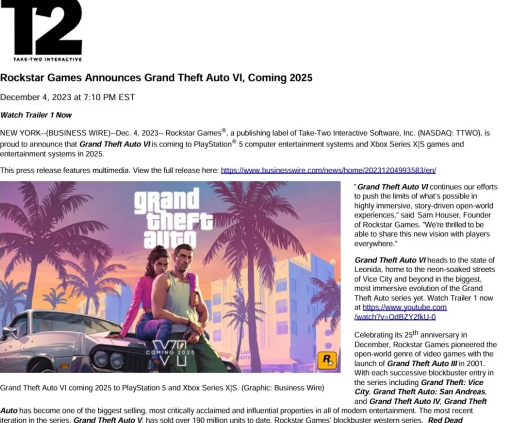 就在最近R星正式发布了GTA6的预告,让很多玩家兴奋不已,终于等到了旷世神作GTA系列的新作,很多玩家还不知道GTA6的发售时间和平台,今天小编为大家介绍一下GTA6发售平台