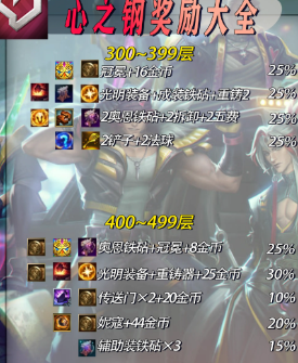 4、300-499层可以获得金币、光明装备、成装铁砧、奥恩铁砧等。