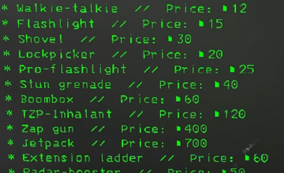 4、我们从上往下能购买的东西为对讲机、手电筒、铁锹、开锁器、大手电筒、闪光弹、音响、TZP吸入剂、电击枪、喷气背包、梯子、雷达。