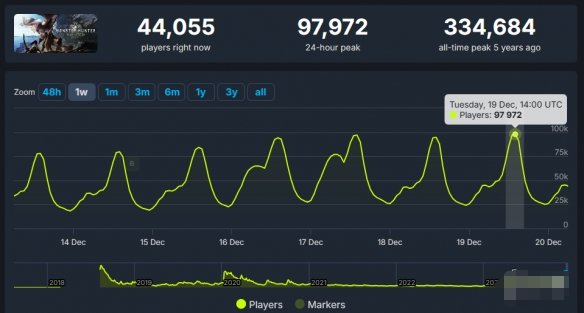 在《怪物猎人:荒野》公布、“Retrun to World”活动、史低促销等因素的加持下,让《怪物猎人:世界》的Steam在线玩家人数飙升,据SteamDB显示,12月19日时《怪物猎人:世界》Steam在线峰值为97972人,这一数据是3年来的最高纪录。据SteamCharts显示上一次《怪物猎人:世界》Steam在线峰值突破10万,还是在2020年10月份(121990),看来真的是有不少老玩家回归了。