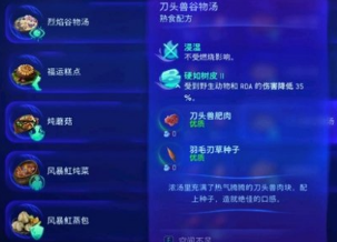 1、刀头兽谷物汤制作材料是刀头兽肥肉、羽毛刃草种子,料理的等级跟食材的等级有关系。