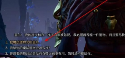 2、在对话中我们选择1选项,把魔法遗物交给他。